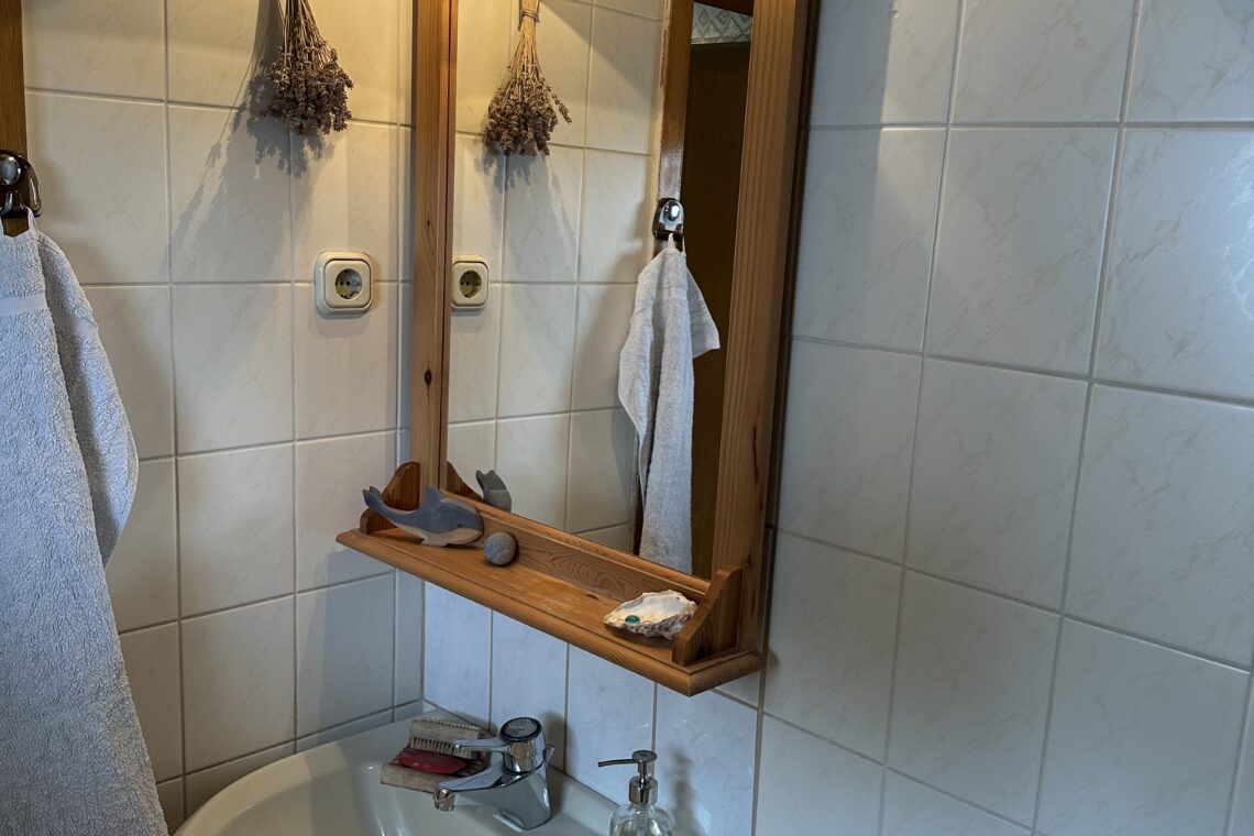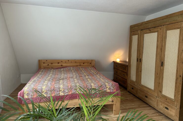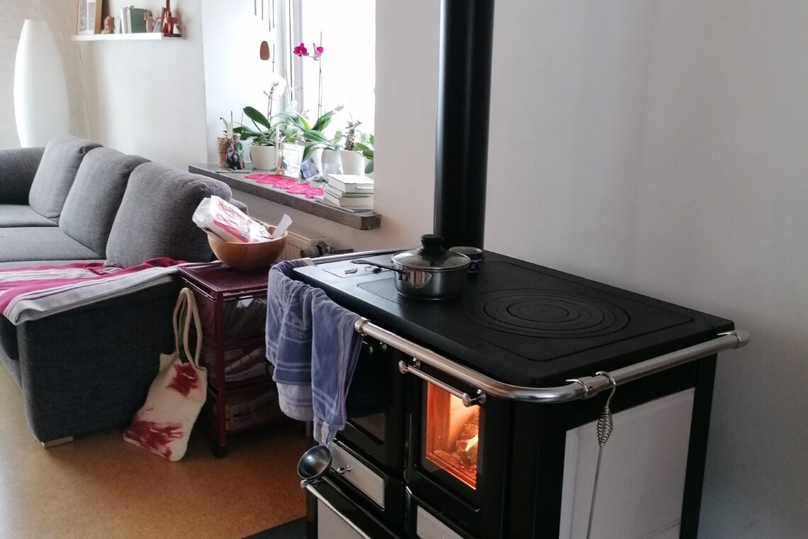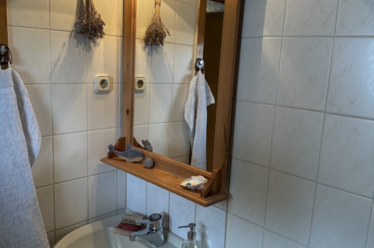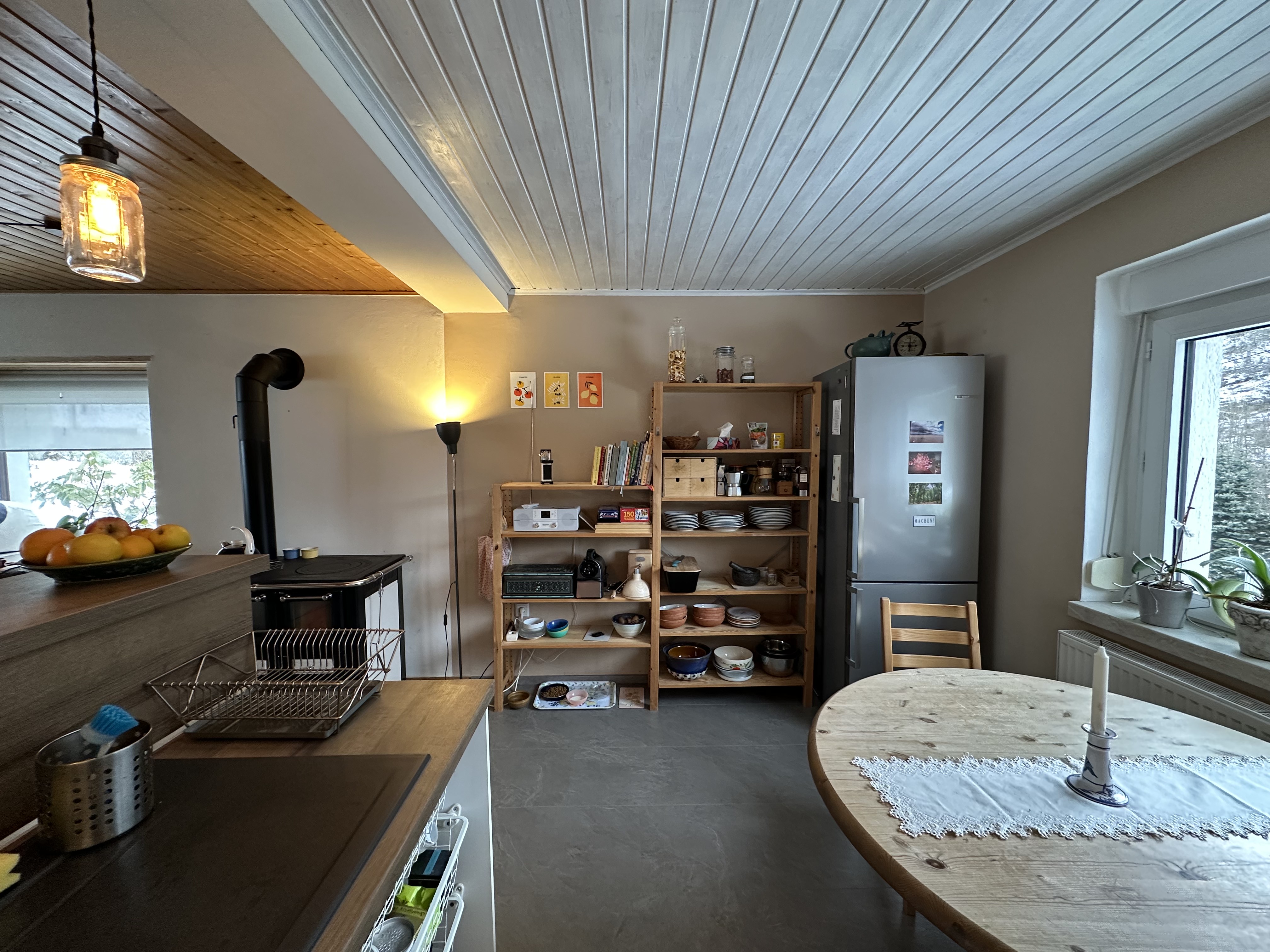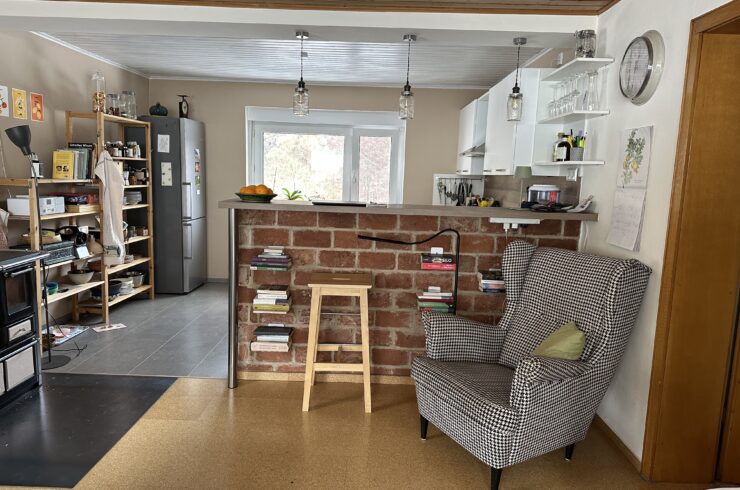 - EG mit großem Wohnbereich mit halboffener Küche, Esbereich, Holzfeuerküchenofen, Einbauküche, großes Doppelzimmer mit ca. 26 qm, kleines Tageslichtbad mit Wanne, WC und Handwaschbecken, Vorratsraum und Diele mit Kaminofen.