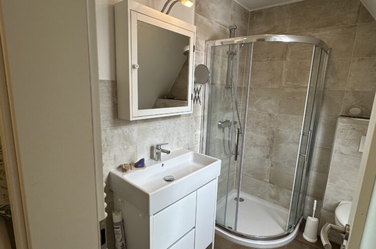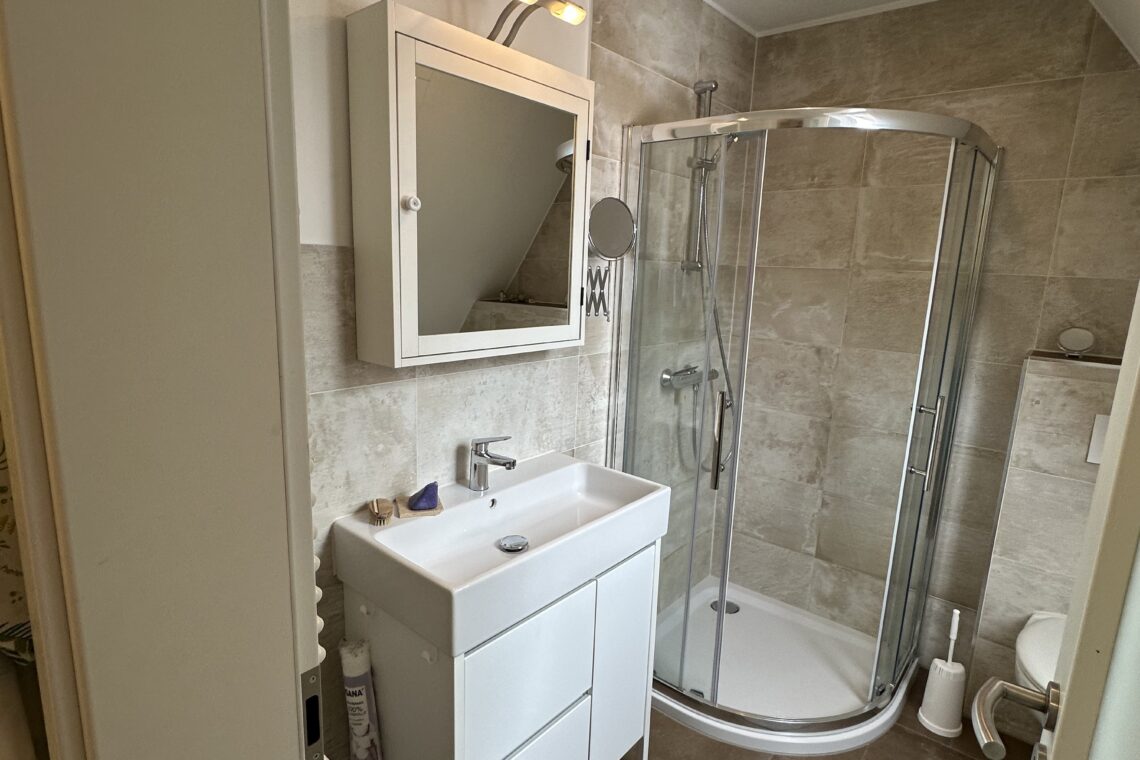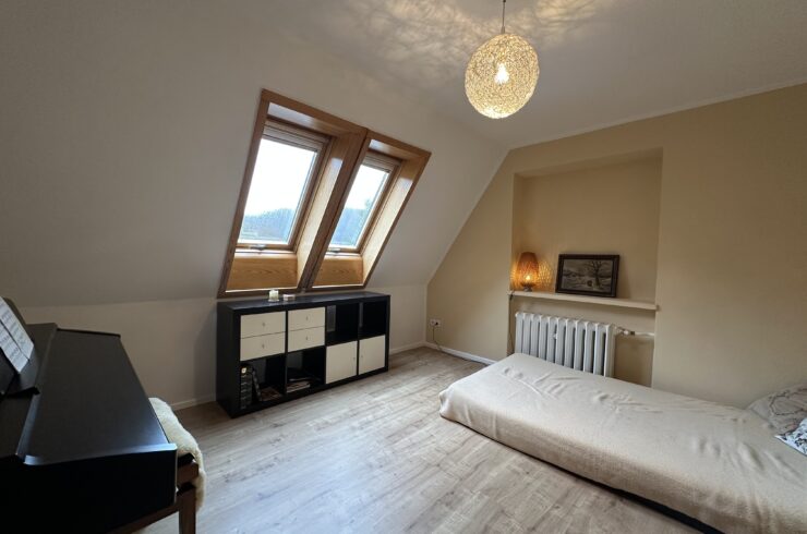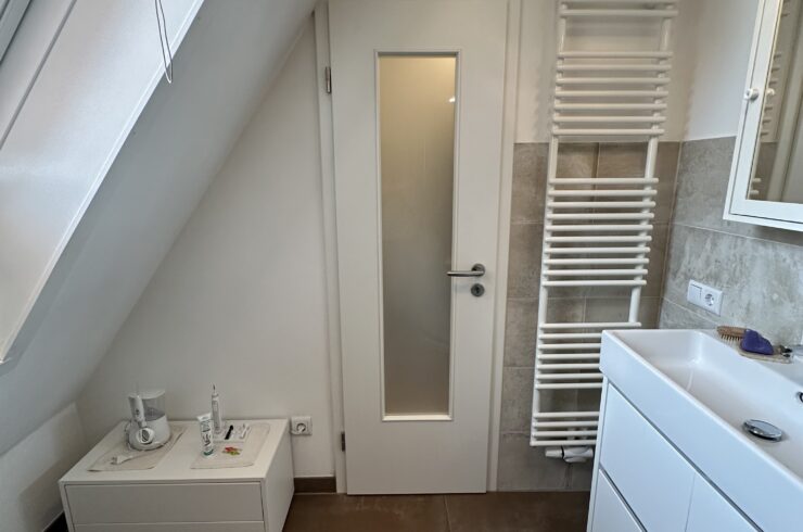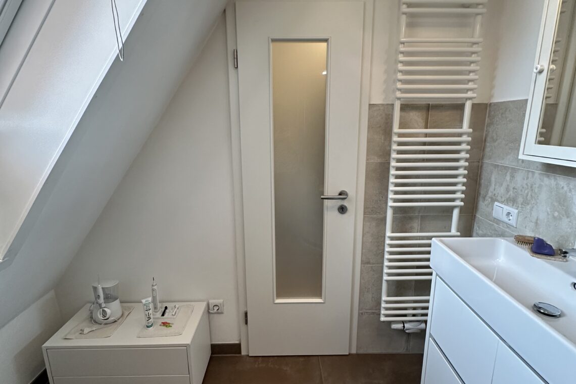 - OG mit 3 Schlafzimmern, Tageslichtbadezimmer mit nahezu bodentiefer Dusche, WC und Waschbecken und Handtuchheizkörper sowie Diele mit Zugang zum Dachspitzboden.